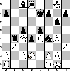 game notation in PGN-format [Event "PUNSCH-Turnier"] [Site "www.myChess.de"] [Date "2010.10.18"] [Round "1"] [White "Ziegert"] [Black "haggard"] [ECO "B34"] [WhitemyELO "1522"] [BlackmyELO "1814"] [Result "0-1"] [TimeControl "10/2592000"] [WhiteDays "29"] [BlackDays "30"] [MyChessNo "69047"] 1. e4 c5 2. Nf3 Nc6 3. d4 cxd4 4. Nxd4 g6 5. Nc3 Bg7 6. Be3 Nf6 7. Qd2 Ng4 8. Nxc6 bxc6 9. Bd4 Bxd4 10. Qxd4 e5 11. Qc5 Qe7 12. Qc4 O-O 13. h3 Nf6 14. Be2 Rb8 15. b3 Bb7 16. O-O d5 17. Qd3 Rfd8 18. Qf3 d4 19. Nb1 Nh5 20. Nd2 c5 21. Qd3 Nf4 22. Qc4 Bc8 23. Bg4 Rb4 0-1 position notation in FEN-format 2br2k1/p3qp1p/6p1/2p1p3/1rQpPnB1/1P5P/P1PN1PP1/R4RK1 - - - 6 24 Captured white pieces: ![]() ![]() ![]() ![]() ![]() ![]() ![]() ![]() ![]() ![]() ![]() ![]() ![]() ![]() ![]() Captured black pieces: ![]() ![]() ![]() ![]() ![]() ![]() ![]() ![]() ![]() ![]() ![]() ![]() ![]() ![]() ![]() Click on a captured piece in order to display the desired move!