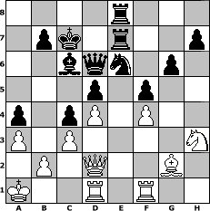 game notation in PGN-format [Event "6. HK-960-Pokal"] [Site "www.myChess.de"] [Date "2012.11.30"] [Round "1"] [White "Winston"] [Black "kari6katz"] [Variant "Fischerrandom"] [SetUp "1"] [FEN "rkqnbbrn/pppppppp/8/8/8/8/PPPPPPPP/RKQNBBRN w KQkq - 0 1"] [WhitemyELO "1426"] [BlackmyELO "1768"] [Result "0-1"] [TimeControl "10/1728000"] [WhiteDays "00"] [BlackDays "20"] [MyChessNo "85235"] 1. g3 d5 2. Bg2 e6 3. d4 Bd6 4. f4 f6 5. Nhf2 c5 6. Qd2 c4 7. Bh3 Qc7 8. Qe3 Bd7 9. Bc3 g6 10. Qd2 f5 11. g4 Bxf4 12. e3 Bxh2 13. Rg2 Bd6 14. gxf5 exf5 15. Rg1 a5 16. Bg2 Bc6 17. Nh3 a4 18. a3 Nhf7 19. Ndf2 Re8 20. Nf4 Bxf4 21. exf4 Ne6 22. Nh3 Nd6 23. Bb4 Nb5 24. c3 O-O-O 25. O-O-O Nd6 26. Bxd6 Qxd6 27. Kb1 Kc7 28. Rgf1 Re7 29. Ka1 Rde8 0-1 position notation in FEN-format 4r3/1pk1r2p/2bqn1p1/3p1p2/p1pP1P2/P1P4N/1P1Q2B1/K2R1R2 - - - 6 30 Captured white pieces: Captured black pieces: Click on a captured piece in order to display the desired move!