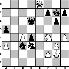 game notation in PGN-format [Event "Die Eisenbahner sind wieder da!!"] [Site "www.myChess.de"] [Date "2016.09.09"] [Round "1"] [White "Erich"] [Black "Peterlie77 (C)"] [Variant "Fischerrandom"] [SetUp "1"] [FEN "bnnrqbkr/pppppppp/8/8/8/8/PPPPPPPP/BNNRQBKR w KQkq - 0 1"] [WhitemyELO "2117"] [BlackmyELO "2126"] [Result "1/2-1/2"] [TimeControl "10/1728000"] [WhiteDays "59"] [BlackDays "38"] [MyChessNo "104849"] 1. e4 b6 2. Nc3 e6 3. d4 d5 4. exd5 exd5 5. Nd3 Nd6 6. Ne2 g6 7. Nef4 Bg7 8. b3 O-O 9. Be2 Qe7 10. O-O Rfe8 11. Qd2 Nd7 12. Rfe1 Qg5 13. g3 Ne4 14. Qc1 c5 15. h4 Qe7 16. dxc5 Bxa1 17. Qxa1 bxc5 18. Bf3 Ndf6 19. a3 Qd6 20. c4 d4 21. b4 Nd7 22. Bg2 a5 23. Re2 Nc3 24. Rxe8+ Rxe8 25. Re1 Rxe1+ 26. Qxe1 Bxg2 27. Qe8+ Kg7 28. bxc5 Nxc5 29. Kxg2 Nxd3 1/2-1/2 position notation in FEN-format 4Q3/5pkp/3q2p1/p7/2Pp1N1P/P1nn2P1/5PK1/8 - - - 0 30 Captured white pieces: Captured black pieces: Click on a captured piece in order to display the desired move!