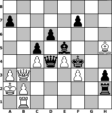 game notation in PGN-format [Event "Winter 2018"] [Site "www.myChess.de"] [Date "2018.01.10"] [Round "2"] [White "HPB2005"] [Black "Grubengeist"] [ECO "A15"] [WhitemyELO "1899"] [BlackmyELO "2086"] [Result "0-1"] [TimeControl "10/2592000"] [WhiteDays "112"] [BlackDays "090"] [MyChessNo "111047"] 1. c4 Nf6 2. Nf3 g6 3. Nc3 Bg7 4. Qb3 O-O 5. d4 d6 6. Bg5 c5 7. d5 Re8 8. e4 e6 9. Bd3 exd5 10. Nxd5 h6 11. Nxf6+ Bxf6 12. Bxh6 Nc6 13. Be3 Be6 14. a3 Rb8 15. Qc2 Bg4 16. Be2 Bxf3 17. gxf3 Nd4 18. Bxd4 Bxd4 19. h4 Kg7 20. O-O-O Rh8 21. h5 Rxh5 22. Rxh5 gxh5 23. Qa4 Qg5+ 24. Kc2 h4 25. Qd7 Rh8 26. Qh3 Kf6 27. Rh1 Bxf2 28. Qd7 Bg3 29. Bf1 Qe3 30. Bh3 Rh5 31. Qxb7 Qe2+ 32. Kb1 Rg5 33. Bf1 Qf2 34. Bh3 Be5 35. Ka2 Rg3 36. Bg4 Rg2 37. Rb1 Qd4 38. Qb3 Kg5 39. Bh3 Rh2 40. Bg4 Kf4 41. Bh5 h3 0-1 position notation in FEN-format 8/p4p2/3p4/2p1b2B/2PqPk2/PQ3P1p/KP5r/1R6 - - - 0 42 Captured white pieces: Captured black pieces: Click on a captured piece in order to display the desired move!