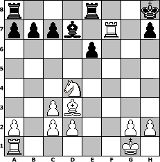 game notation in PGN-format [Event "Schon wieder."] [Site "www.myChess.de"] [Date "2017.10.12"] [Round "2"] [White "alibengali"] [Black "Knight"] [ECO "D00"] [WhitemyELO "1661"] [BlackmyELO "1133"] [Result "1-0"] [TimeControl "10/2592000"] [WhiteDays "57"] [BlackDays "60"] [MyChessNo "109915"] 1. d4 d5 2. e4 dxe4 3. Nc3 Nf6 4. f3 exf3 5. Qxf3 e6 6. Be3 Bb4 7. Bd3 Nc6 8. Nge2 O-O 9. O-O Re8 10. Bg5 Nxd4 11. Nxd4 Bxc3 12. bxc3 Bd7 13. Bxf6 gxf6 14. Qxf6 Qxf6 15. Rxf6 Kh8 16. Rxf7 1-0 position notation in FEN-format r3r2k/pppb1R1p/4p3/8/3N4/2PB4/P1PP2PP/R5K1 - - - 0 16 Captured white pieces: Captured black pieces: Click on a captured piece in order to display the desired move!