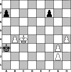 game notation in PGN-format [Event "Februar 2018"] [Site "www.myChess.de"] [Date "2018.02.03"] [Round "1"] [White "Steffi"] [Black "beowulf"] [ECO "D10"] [WhitemyELO "1504"] [BlackmyELO "1344"] [Result "1-0"] [TimeControl "10/1728000"] [WhiteDays "69"] [BlackDays "79"] [MyChessNo "111280"] 1. d4 d5 2. c4 c6 3. Nc3 Nf6 4. Bg5 Bg4 5. Bxf6 gxf6 6. cxd5 cxd5 7. Qb3 Qd7 8. e3 e5 9. Bb5 Nc6 10. Nxd5 O-O-O 11. Nxf6 Qe6 12. Qxe6+ Bxe6 13. Bxc6 bxc6 14. Ne2 Bb4+ 15. Nc3 exd4 16. exd4 Rxd4 17. O-O h6 18. Nfe4 Bd5 19. Nxd5 cxd5 20. Ng3 Rd2 21. a3 Bd6 22. b4 Bxg3 23. fxg3 Rf8 24. Rf6 d4 25. Rxh6 d3 26. Rf6 Rc2 27. Rf2 Rd8 28. Rd1 Rd7 29. Rfd2 Rxd2 30. Rxd2 Kc7 31. Kf2 Kc6 32. Ke3 Kb5 33. Rxd3 Rxd3+ 34. Kxd3 Ka4 35. h4 Kxa3 36. Kc4 1-0 position notation in FEN-format 8/p4p2/8/8/1PK4P/k5P1/6P1/8 - - - 1 36 Captured white pieces: Captured black pieces: Click on a captured piece in order to display the desired move!