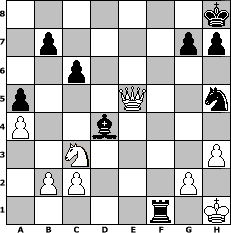 game notation in PGN-format [Event "Neujahrsturnier 2016"] [Site "www.myChess.de"] [Date "2015.12.17"] [Round "1"] [White "Joschi"] [Black "bjeu"] [ECO "B00"] [WhitemyELO "1590"] [BlackmyELO "2143"] [Result "0-1"] [TimeControl "10/2592000"] [WhiteDays "90"] [BlackDays "54"] [MyChessNo "101644"] 1. e4 a5 2. d4 Nf6 3. Nc3 e6 4. Nf3 d6 5. Bd3 Be7 6. O-O O-O 7. Re1 Nbd7 8. Bd2 e5 9. Qe2 c6 10. h3 Re8 11. a4 exd4 12. Nxd4 d5 13. exd5 Bc5 14. Ne6 fxe6 15. dxe6 Nf8 16. Bc4 Bxe6 17. Bxe6+ Rxe6 18. Qc4 Qxd2 19. Rxe6 Qxf2+ 20. Kh1 Nxe6 21. Qxe6+ Kh8 22. Re1 Nh5 23. Qe5 Rf8 24. Rc1 Qf1+ 25. Rxf1 Rxf1+ 26. Kh2 Bg1+ 27. Kh1 Bd4+ 0-1 position notation in FEN-format 7k/1p4pp/2p5/p3Q2n/P2b4/2N4P/1PP3P1/5r1K - - - 4 28 Captured white pieces: Captured black pieces: Click on a captured piece in order to display the desired move!