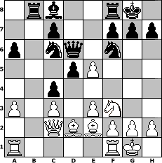 game notation in PGN-format [Event "Entdeckung der Langsamkeit III"] [Site "www.myChess.de"] [Date "2013.03.15"] [Round "1"] [White "Schachboy1"] [Black "Teresa"] [ECO "E10"] [WhitemyELO "1598"] [BlackmyELO "1531"] [Result "1-0"] [TimeControl "10/3456000"] [WhiteDays "54"] [BlackDays "77"] [MyChessNo "87122"] 1. d4 Nf6 2. c4 e6 3. Nf3 d5 4. Nc3 Bb4 5. c5 Nc6 6. Bd2 O-O 7. e3 b6 8. Bd3 bxc5 9. O-O c4 10. Be2 a6 11. Qa4 Qd6 12. a3 Bxc3 13. bxc3 Rb8 14. Qc2 e5 15. dxe5 1-0 position notation in FEN-format 1rb2rk1/2p2ppp/p1nq1n2/3pP3/2p5/P1P1PN2/2QBBPPP/R4RK1 - - - 0 15 Captured white pieces: Captured black pieces: Click on a captured piece in order to display the desired move!