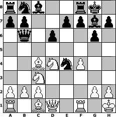 game notation in PGN-format [Event "1. mySchach Pfingst Open 2014"] [Site "www.myChess.de"] [Date "2014.06.08"] [Round "1"] [White "Grubengeist"] [Black "hubi"] [ECO "A04"] [WhitemyELO "2008"] [BlackmyELO "1897"] [Result "0-1"] [TimeControl "10/3456000"] [WhiteDays "40"] [BlackDays "25"] [MyChessNo "94658"] 1. Nf3 c5 2. e4 d6 3. d4 cxd4 4. Nxd4 g6 5. Bc4 Bg7 6. Nc3 Nf6 7. O-O O-O 8. f4 Qb6 9. Kh1 Nxe4 0-1 position notation in FEN-format rnb2rk1/pp2ppbp/1q1p2p1/8/2BNnP2/2N5/PPP3PP/R1BQ1R1K - - - 0 10 Captured white pieces: Captured black pieces: Click on a captured piece in order to display the desired move!