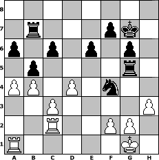 game notation in PGN-format [Event "2.No-Engine-Schachturnier"] [Site "www.myChess.de"] [Date "2013.08.15"] [Round "1"] [White "Master1"] [Black "faustballer"] [ECO "D00"] [WhitemyELO "1270"] [BlackmyELO "1543"] [Result "0-1"] [TimeControl "10/1728000"] [WhiteDays "00"] [BlackDays "20"] [MyChessNo "89783"] 1. d4 d5 2. e3 a6 3. Bd3 b5 4. Nf3 Bb7 5. Nbd2 g6 6. O-O Bg7 7. c3 Nf6 8. Re1 O-O 9. h3 Nbd7 10. e4 dxe4 11. Nxe4 Rb8 12. Bd2 Nxe4 13. Bxe4 Nf6 14. Bxb7 Rxb7 15. Bg5 Re8 16. b4 h6 17. Bf4 Nd5 18. Bd2 c6 19. a3 e6 20. Ne5 Bxe5 21. Bxh6 Bg7 22. Bxg7 Kxg7 23. Qd2 Rh8 24. Re2 Rh5 25. a4 Qg5 26. Qxg5 Rxg5 27. Rc2 Nf4 0-1 position notation in FEN-format 8/1r3pk1/p1p1p1p1/1p4r1/PP1P1n2/2P4P/2R2PP1/R5K1 - - - 2 28 Captured white pieces: Captured black pieces: Click on a captured piece in order to display the desired move!