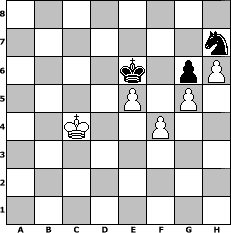 game notation in PGN-format [Event "mySchachR6 (1600-1900)"] [Site "www.myChess.de"] [Date "2009.07.03"] [Round "1"] [White "Helmut48"] [Black "Nowak"] [ECO "E38"] [WhitemyELO "1791"] [BlackmyELO "1697"] [Result "1/2-1/2"] [TimeControl "10/1728000"] [WhiteDays "20"] [BlackDays "20"] [MyChessNo "57132"] 1. d4 Nf6 2. c4 e6 3. Nc3 Bb4 4. Qc2 c5 5. dxc5 Bxc5 6. Nf3 O-O 7. e3 Qe7 8. a3 d5 9. b4 Bb6 10. Bb2 Nc6 11. Bd3 dxc4 12. Bxc4 Bd7 13. Na4 Rfc8 14. Nxb6 axb6 15. O-O b5 16. Bd3 Nxb4 17. Bxf6 Rxc2 18. Bxh7+ Kxh7 19. Bxe7 Nd5 20. Rfd1 Nxe7 21. Rxd7 Rxa3 22. Rf1 Nc6 23. Rxf7 b4 24. Rxb7 b3 25. Rb1 Na5 26. Rb5 Nc4 27. Nd4 Rb2 28. Rc1 e5 29. h3 Nd6 30. Rxe5 Rd2 31. Nxb3 Rxb3 32. Re7 Rbb2 33. Rd7 Ne4 34. Rxd2 Rxd2 35. f3 Nf6 36. e4 Nh5 37. Rf1 Ng3 38. Rf2 Rd1+ 39. Kh2 Nf1+ 40. Kg1 Ne3+ 41. Kh2 Kg6 42. Kg3 Rd2 43. Rxd2 Nf1+ 44. Kf4 Nxd2 45. g4 Nb3 46. h4 Nd4 47. h5+ Kf7 48. g5 g6 49. h6 Ne6+ 50. Kg4 Nc5 51. e5 Ne6 52. f4 Nd4 53. Kg3 Ne6 54. Kf3 Nf8 55. Ke3 Ke6 56. Ke4 Nh7 57. Kd3 Kf5 58. Kd4 Ke6 59. Ke4 Nf8 60. Kd4 Nh7 61. Kc4 Nf8 62. Kc5 Nh7 63. Kc4 1/2-1/2 position notation in FEN-format 8/7n/4k1pP/4P1P1/2K2P2/8/8/8 - - - 22 63 Captured white pieces: Captured black pieces: Click on a captured piece in order to display the desired move!