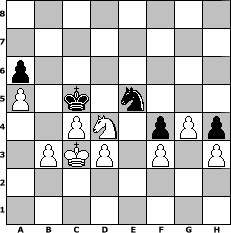 game notation in PGN-format [Event "Pott Schach - Glück Auf die xte."] [Site "www.myChess.de"] [Date "2020.11.05"] [Round "1"] [White "martinus"] [Black "beowulf"] [ECO "B30"] [WhitemyELO "1648"] [BlackmyELO "1399"] [Result "1-0"] [TimeControl "10/2592000"] [WhiteDays "180"] [BlackDays "180"] [MyChessNo "119721"] 1. e4 c5 2. Nf3 Nc6 3. Bc4 Nf6 4. Ng5 e6 5. d3 h6 6. Nf3 d5 7. Bb5 Bd7 8. exd5 exd5 9. O-O Be7 10. Re1 O-O 11. Bf4 a6 12. Bxc6 Bxc6 13. Ne5 Re8 14. Nxc6 bxc6 15. Nd2 Qd7 16. Nf3 Bd6 17. Bxd6 Qxd6 18. Qd2 Rxe1+ 19. Rxe1 Re8 20. Rxe8+ Nxe8 21. Qe3 Kf8 22. c3 Qe7 23. Qxe7+ Kxe7 24. Ne5 Nc7 25. Nxc6+ Kd6 26. Nd8 Ke7 27. Nc6+ Kd6 28. Nd8 Ke7 29. Nb7 Ne6 30. f3 f5 31. Kf2 g5 32. g3 h5 33. Ke3 Kd7 34. Na5 d4+ 35. Kd2 Kd6 36. c4 f4 37. Nb3 h4 38. g4 Nf8 39. a4 Ng6 40. h3 Ne5 41. Ke2 Kc6 42. Nd2 Kb6 43. Ne4 Nf7 44. Kd2 Kc6 45. Kc2 Kb6 46. b3 Kc6 47. a5 Kb7 48. Nxc5+ Kc6 49. Ne4 Ne5 50. Nxg5 Kc5 51. Ne6+ Kd6 52. Nxd4 Kc5 53. Kc3 1-0 position notation in FEN-format 8/8/p7/P1k1n3/2PN1pPp/1PKP1P1P/8/8 - - - 2 53 Captured white pieces: Captured black pieces: Click on a captured piece in order to display the desired move!