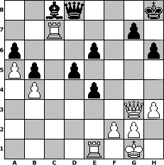 game notation in PGN-format [Event "Oktoberfest"] [Site "www.myChess.de"] [Date "2011.10.06"] [Round "1"] [White "Winston"] [Black "Sanji"] [ECO "C00"] [WhitemyELO "1459"] [BlackmyELO "1511"] [Result "1-0"] [TimeControl "10/2592000"] [WhiteDays "115"] [BlackDays "113"] [MyChessNo "76635"] 1. e4 e6 2. e5 d5 3. d4 c5 4. Nf3 Nc6 5. Bb5 Bd7 6. Bxc6 Bxc6 7. O-O cxd4 8. Qxd4 Ne7 9. Bg5 h6 10. Bxe7 Bxe7 11. a4 O-O 12. b4 a6 13. Nbd2 Rc8 14. h3 b5 15. a5 f6 16. Rab1 Bd7 17. Qd3 Qc7 18. Rfe1 Qxc2 19. Qe3 Qc7 20. Nh4 fxe5 21. Ng6 Bg5 22. Qe2 Rf5 23. Nf3 e4 24. Nxg5 Rxg5 25. Ne7+ Kh8 26. Nxc8 Bxc8 27. Rbc1 Qd8 28. Qe3 Rf5 29. Qg3 Rf7 30. Rc5 Rc7 31. Rxc7 1-0 position notation in FEN-format 2bq3k/2R3p1/p3p2p/Pp1p4/1P2p3/6QP/5PP1/4R1K1 - - - 0 31 Captured white pieces: Captured black pieces: Click on a captured piece in order to display the desired move!