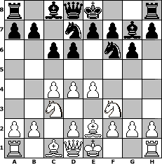 game notation in PGN-format [Event "Gegen die Sommerflaute"] [Site "www.myChess.de"] [Date "2013.07.17"] [Round "1"] [White "Steffi"] [Black "Seneca"] [ECO "A42"] [WhitemyELO "1514"] [BlackmyELO "1554"] [Result "0-1"] [TimeControl "10/864000"] [WhiteDays "00"] [BlackDays "09"] [MyChessNo "89335"] 1. d4 d6 2. c4 Nf6 3. Nc3 g6 4. Nf3 Bg7 5. e4 c6 6. Be2 Nbd7 0-1 position notation in FEN-format r1bqk2r/pp1nppbp/2pp1np1/8/2PPP3/2N2N2/PP1PBPPP/R1BQK2R - KQkq - 2 7 Captured white pieces: Captured black pieces: Click on a captured piece in order to display the desired move!