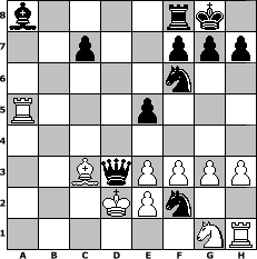 game notation in PGN-format [Event "1.Chess in Friendship"] [Site "www.myChess.de"] [Date "2004.08.10"] [Round "1"] [White "OwainGwynedd"] [Black "Tarot"] [ECO "A00"] [WhitemyELO "1263"] [BlackmyELO "1829"] [Result "0-1"] [TimeControl "10/2592000"] [WhiteDays "89"] [BlackDays "90"] [MyChessNo "6072"] 1. e3 d5 2. d3 e5 3. c3 Nf6 4. g3 Bd6 5. b4 a5 6. Qa4+ b5 7. Qxb5+ Bd7 8. Qb7 Bc6 9. Qxa8 Bxa8 10. a3 d4 11. f3 axb4 12. axb4 Nbd7 13. h3 dxc3 14. Nxc3 Bxb4 15. Bd2 O-O 16. Ra4 Bxc3 17. Bxc3 Nc5 18. Ra5 Nxd3+ 19. Kd2 Nf2+ 20. Bd3 Qxd3+ 0-1 position notation in FEN-format b4rk1/2p2ppp/5n2/R3p3/8/2BqPPPP/3KPn2/6NR - - - 0 21 Captured white pieces: Captured black pieces: Click on a captured piece in order to display the desired move!