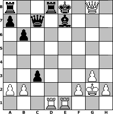 game notation in PGN-format [Event "Sommerferien 2010"] [Site "www.myChess.de"] [Date "2010.06.20"] [Round "2"] [White "sprinterde"] [Black "Joschi"] [ECO "B17"] [WhitemyELO "1668"] [BlackmyELO "1565"] [Result "1-0"] [TimeControl "10/2592000"] [WhiteDays "84"] [BlackDays "86"] [MyChessNo "66421"] 1. e4 c6 2. d4 d5 3. Nc3 dxe4 4. Nxe4 Nd7 5. g3 Ngf6 6. Nxf6+ Nxf6 7. Bg2 e6 8. Bg5 Be7 9. Ne2 h6 10. Bxf6 Bxf6 11. O-O O-O 12. c3 Qc7 13. Re1 b6 14. Qa4 Bb7 15. Nf4 Rfb8 16. Nh5 Be7 17. Qd1 c5 18. Qg4 g6 19. Nf4 Bxg2 20. Kxg2 cxd4 21. Nxg6 fxg6 22. Qxg6+ Kf8 23. Qxh6+ Ke8 24. Qxe6 dxc3 25. Rad1 Rd8 26. Qg8# 1-0 position notation in FEN-format r2rk1Q1/p1q1b3/1p6/8/8/2p3P1/PP3PKP/3RR3 - - - 3 26 Captured white pieces: Captured black pieces: Click on a captured piece in order to display the desired move!