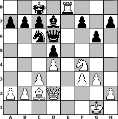 game notation in PGN-format [Event "Neujahr 2015"] [Site "www.myChess.de"] [Date "2014.12.30"] [Round "1"] [White "jeremyt"] [Black "woern63"] [ECO "B01"] [WhitemyELO "2073"] [BlackmyELO "1918"] [Result "1/2-1/2"] [TimeControl "10/2592000"] [WhiteDays "75"] [BlackDays "79"] [MyChessNo "97330"] 1. e4 d5 2. exd5 Qxd5 3. Nc3 Qa5 4. d4 Nf6 5. Bc4 Bg4 6. f3 Bd7 7. Nge2 e6 8. O-O Nc6 9. Be3 Nd5 10. Nxd5 exd5 11. Bd2 Bb4 12. Bxb4 Nxb4 13. Bb3 O-O-O 14. c3 Nc6 15. Nf4 Ne7 16. Re1 Rhe8 17. Qd2 g6 18. Bc2 Qa6 19. Re2 Qd6 20. Rae1 Nc6 21. g3 Rxe2 22. Rxe2 Re8 23. Rxe8+ 1/2-1/2 position notation in FEN-format 2k1R3/pppb1p1p/2nq2p1/3p4/3P1N2/2P2PP1/PPBQ3P/6K1 - - - 0 23 Captured white pieces: Captured black pieces: Click on a captured piece in order to display the desired move!