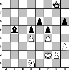 game notation in PGN-format [Event "Neues Jahr neue Er"] [Site "www.myChess.de"] [Date "2017.01.06"] [Round "2"] [White "lotchi"] [Black "sprinterde"] [ECO "A00"] [WhitemyELO "1157"] [BlackmyELO "1730"] [Result "1/2-1/2"] [TimeControl "10/2592000"] [WhiteDays "147"] [BlackDays "090"] [MyChessNo "106400"] 1. Nc3 Nf6 2. Nf3 e6 3. d4 d5 4. Bg5 h6 5. Bxf6 Qxf6 6. e3 Bb4 7. a3 Bxc3+ 8. bxc3 Nd7 9. c4 O-O 10. Be2 Nb6 11. O-O dxc4 12. a4 a5 13. c3 c6 14. Ne5 Nd5 15. Qd2 Ne7 16. f4 b5 17. Bd1 Nd5 18. Bf3 b4 19. cxb4 c3 20. Qd3 axb4 21. Bxd5 cxd5 22. Rfb1 Ba6 23. Qc2 Qe7 24. Nc6 Qc7 25. Nxb4 Rfb8 26. Rb3 Qc4 27. Rab1 Qe2 28. Qxe2 Bxe2 29. Rxc3 Rxa4 30. Rcb3 Bc4 31. R3b2 f5 32. Nc6 Rxb2 33. Rxb2 Ra3 34. Kf2 g5 35. h3 gxf4 36. exf4 Ra6 37. Nb4 Rb6 38. Nd3 Rxb2+ 39. Nxb2 Bb5 40. Nd1 1/2-1/2 position notation in FEN-format 6k1/8/4p2p/1b1p1p2/3P1P2/7P/5KP1/3N4 - - - 2 40 Captured white pieces: Captured black pieces: Click on a captured piece in order to display the desired move!