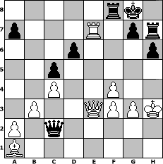 game notation in PGN-format [Event "Siebenschl"] [Site "www.myChess.de"] [Date "2009.07.07"] [Round "1"] [White "RashimIbenRohal"] [Black "rikilatic"] [Variant "Fischerrandom"] [SetUp "1"] [FEN "bqnbnrkr/pppppppp/8/8/8/8/PPPPPPPP/BQNBNRKR w KQkq - 0 1"] [WhitemyELO "1522"] [BlackmyELO "1445"] [Result "1/2-1/2"] [TimeControl "10/2592000"] [WhiteDays "103"] [BlackDays "089"] [MyChessNo "57241"] 1. d4 b6 2. Nf3 Qb7 3. Nd3 Ncd6 4. b3 e6 5. e3 Ne4 6. Qc1 Ng5 7. Nde5 Nf6 8. h4 Nge4 9. c4 d6 10. Nd3 Nh5 11. Rh2 h6 12. Nf4 Nxf4 13. exf4 f6 14. Re1 c5 15. dxc5 bxc5 16. Bc2 f5 17. Nd2 Bxh4 18. Nxe4 fxe4 19. Bxe4 Qe7 20. Bxa8 Rxa8 21. Rxh4 Qxh4 22. Rxe6 Rd8 23. g3 Qg4 24. Re7 Rh7 25. Kg2 Rf8 26. f3 Qg6 27. Qe3 Qc2+ 28. Kh3 Qf5+ 29. Kg2 Qc2+ 30. Kh3 Qf5+ 31. Kg2 Qc2+ 32. Kh3 1/2-1/2 position notation in FEN-format 5rk1/p3R1pr/3p3p/2p5/2P2P2/1P2QPPK/P1q5/B7 - - - 12 32 Captured white pieces: Captured black pieces: Click on a captured piece in order to display the desired move!
