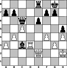 game notation in PGN-format [Event "Chess960 f"] [Site "www.myChess.de"] [Date "2013.03.24"] [Round "1"] [White "Erich"] [Black "MathiasNowak"] [Variant "Fischerrandom"] [SetUp "1"] [FEN "nnqrkbbr/pppppppp/8/8/8/8/PPPPPPPP/NNQRKBBR w KQkq - 0 1"] [WhitemyELO "1998"] [BlackmyELO "1922"] [Result "1/2-1/2"] [TimeControl "10/2592000"] [WhiteDays "30"] [BlackDays "27"] [MyChessNo "87403"] 1. e4 Nc6 2. d4 d5 3. exd5 Rxd5 4. f4 e6 5. Nb3 Nb6 6. c4 Rd8 7. Be3 h6 8. a3 Bh7 9. Bd3 Bxd3 10. Rxd3 Ne7 11. O-O Nf5 12. Bf2 c5 13. Rfd1 cxd4 14. c5 Nd5 15. Nxd4 Nxd4 16. Bxd4 Qc7 17. g3 h5 18. h4 Be7 19. b4 O-O 20. Nc3 Qc6 21. Kh2 Rfe8 22. Qc2 Nf6 23. Bxf6 Bxf6 24. Rd6 Rxd6 25. Rxd6 Qf3 26. Rd3 Qc6 27. Qe2 Bxc3 1/2-1/2 position notation in FEN-format 4r1k1/pp3pp1/2q1p3/2P4p/1P3P1P/P1bR2P1/4Q2K/8 - - - 0 28 Captured white pieces: Captured black pieces: Click on a captured piece in order to display the desired move!