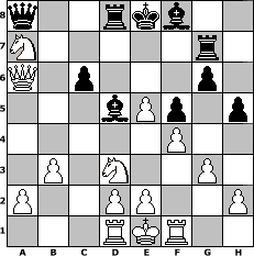 game notation in PGN-format [Event "Myschach 960er Blitz-Open"] [Site "www.myChess.de"] [Date "2006.02.28"] [Round "1"] [White "Juri"] [Black "MichaelKnopf"] [Variant "Fischerrandom"] [SetUp "1"] [FEN "qnnrkrbb/pppppppp/8/8/8/8/PPPPPPPP/QNNRKRBB w KQkq - 0 1"] [WhitemyELO "1428"] [BlackmyELO "1531"] [Result "1/2-1/2"] [TimeControl "10/86400"] [WhiteDays "02"] [BlackDays "02"] [MyChessNo "23076"] 1. e4 d5 2. e5 f6 3. b3 e6 4. f4 f5 5. Bc5 Rf7 6. Qd4 b6 7. Ba3 Nc6 8. Qa4 g6 9. g3 a6 10. c4 N8a7 11. cxd5 exd5 12. Qxa6 b5 13. Bc5 h5 14. Nd3 Bg7 15. Nc3 Bf8 16. Bxd5 Rg7 17. Nxb5 Bxd5 18. Bxa7 Nxa7 19. Nxa7 c6 1/2-1/2 position notation in FEN-format q2rkb2/N5r1/Q1p3p1/3bPp1p/5P2/1P1N2P1/P2PP2P/3RKR2 - KQq - 0 20 Captured white pieces: Captured black pieces: Click on a captured piece in order to display the desired move!