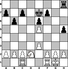 game notation in PGN-format [Event "unter uns Nr. 41 (Advendturnier 2017)"] [Site "www.myChess.de"] [Date "2017.11.29"] [Round "2"] [White "borsti"] [Black "S04boy"] [ECO "D01"] [WhitemyELO "1234"] [BlackmyELO "1185"] [Result "1-0"] [TimeControl "10/864000"] [WhiteDays "29"] [BlackDays "26"] [MyChessNo "110536"] 1. d4 d5 2. Nc3 Nf6 3. Bg5 Bf5 4. e3 e6 5. Nf3 Be7 6. Bd3 h6 7. Bh4 g5 8. Bg3 g4 9. Ne5 Bd6 10. Bxf5 Nc6 11. Bxg4 h5 12. Bf3 Nxe5 13. Bxe5 Bxe5 14. dxe5 Ne4 15. Bxe4 dxe4 16. Qxd8+ Rxd8 17. O-O Rd2 18. Rac1 Ke7 19. Nxe4 b6 20. Nxd2 1-0 position notation in FEN-format 7r/p1p1kp2/1p2p3/4P2p/8/4P3/PPPN1PPP/2R2RK1 - - - 0 20 Captured white pieces: Captured black pieces: Click on a captured piece in order to display the desired move!