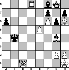 game notation in PGN-format [Event "unter uns Nr. 30 (Weihnachtsturnier)"] [Site "www.myChess.de"] [Date "2015.12.21"] [Round "2"] [White "muellerh"] [Black "reisinger"] [ECO "D20"] [WhitemyELO "1502"] [BlackmyELO "1486"] [Result "1-0"] [TimeControl "10/2592000"] [WhiteDays "087"] [BlackDays "119"] [MyChessNo "101791"] 1. d4 d5 2. c4 dxc4 3. Nc3 Nf6 4. e4 e6 5. e5 Nd5 6. Bxc4 Be7 7. a3 a6 8. Nf3 b5 9. Bb3 Bb7 10. O-O c5 11. Qc2 Nd7 12. Bd2 Nxc3 13. Qxc3 cxd4 14. Nxd4 O-O 15. Rfe1 Bg5 16. f4 Be7 17. Rad1 Qb6 18. Be3 Rac8 19. Qd3 Nc5 20. Qe2 b4 21. Kh1 bxa3 22. bxa3 Rfd8 23. Rb1 Nxb3 24. Rxb3 Qa7 25. Nxe6 Qa8 26. Nxd8 Rxd8 27. f5 Rb8 28. Kg1 Bc8 29. Rxb8 Qxb8 30. f6 Bxa3 31. Bf4 Qb6+ 32. Kh1 g6 33. Qc2 Qb7 34. Rd1 Bf8 35. Rd8 Bf5 36. Bh6 Qb4 37. Qd1 Bg4 38. Qc1 1-0 position notation in FEN-format 3R1bk1/5p1p/p4PpB/4P3/1q4b1/8/6PP/2Q4K - - - 11 38 Captured white pieces: Captured black pieces: Click on a captured piece in order to display the desired move!