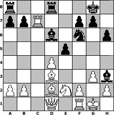 game notation in PGN-format [Event "YOUR LAST BREATH"] [Site "www.myChess.de"] [Date "2019.11.17"] [Round "2"] [White "iamnothere"] [Black "sprinterde"] [ECO "A40"] [WhitemyELO "1432"] [BlackmyELO "1699"] [Result "1-0"] [TimeControl "10/3456000"] [WhiteDays "39"] [BlackDays "40"] [MyChessNo "116369"] 1. d4 e6 2. c4 Nf6 3. Nc3 Bb4 4. Bg5 h6 5. Bd2 c5 6. Nf3 d5 7. e3 Nc6 8. Be2 cxd4 9. Nxd4 Nxd4 10. exd4 O-O 11. O-O dxc4 12. Bxc4 Qc7 13. Bd3 Rd8 14. Ne2 Bd6 15. g3 e5 16. Rc1 Bh3 17. Rxc7 1-0 position notation in FEN-format r2r2k1/ppR2pp1/3b1n1p/4p3/3P4/3B2Pb/PP1BNP1P/3Q1RK1 - - - 0 17 Captured white pieces: Captured black pieces: Click on a captured piece in order to display the desired move!