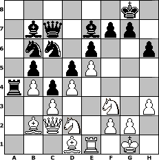 game notation in PGN-format [Event "John Owen Turnier 2011"] [Site "www.myChess.de"] [Date "2011.01.26"] [Round "1"] [White "woern63"] [Black "Grubengeist"] [ECO "B00"] [WhitemyELO "1828"] [BlackmyELO "1904"] [Result "1/2-1/2"] [TimeControl "10/2592000"] [WhiteDays "30"] [BlackDays "16"] [MyChessNo "71519"] 1. e4 b6 2. d4 Bb7 3. Nd2 e6 4. Ngf3 c5 5. c3 Nf6 6. Bd3 Be7 7. O-O d5 8. e5 Nfd7 9. Re1 O-O 10. Qc2 h6 11. a3 Nc6 12. b4 c4 13. Bf1 b5 14. a4 a6 15. h3 Qc7 16. axb5 axb5 17. Rxa8 Rxa8 18. Be2 Ra4 19. Bb2 Nb6 20. Bd1 1/2-1/2 position notation in FEN-format 6k1/1bq1bpp1/1nn1p2p/1p1pP3/rPpP4/2P2N1P/1BQN1PP1/3BR1K1 - - - 5 20 Captured white pieces: Captured black pieces: Click on a captured piece in order to display the desired move!