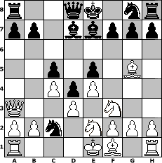 game notation in PGN-format [Event "Die Weinprobe 2017"] [Site "www.myChess.de"] [Date "2017.08.16"] [Round "1"] [White "MiFie"] [Black "Gauss1233"] [ECO "B01"] [WhitemyELO "1000"] [BlackmyELO "1355"] [Result "0-1"] [TimeControl "10/1728000"] [WhiteDays "25"] [BlackDays "16"] [MyChessNo "109277"] 1. e4 d5 2. Nc3 d4 3. Nce2 c5 4. d3 e5 5. Nf3 Nc6 6. c4 Be7 7. Qa4 Bd7 8. Bg5 Nb4 9. Qa3 Nc2+ 0-1 position notation in FEN-format r2qk1nr/pp1bbppp/8/2p1p1B1/2PpP3/Q2P1N2/PPn1NPPP/R3KB1R - KQkq - 7 10 Captured white pieces: Captured black pieces: Click on a captured piece in order to display the desired move!