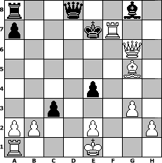 game notation in PGN-format [Event "April April April"] [Site "www.myChess.de"] [Date "2016.04.15"] [Round "1"] [White "espero"] [Black "Joschi"] [Variant "Fischerrandom"] [SetUp "1"] [FEN "rqnnkrbb/pppppppp/8/8/8/8/PPPPPPPP/RQNNKRBB w KQkq - 0 1"] [WhitemyELO "1808"] [BlackmyELO "1522"] [Result "1-0"] [TimeControl "10/2592000"] [WhiteDays "69"] [BlackDays "90"] [MyChessNo "103301"] 1. f4 f5 2. g3 g6 3. c3 e5 4. fxe5 Bxe5 5. d4 Bg7 6. Nd3 d5 7. N1f2 Nc6 8. Nf4 N6e7 9. N2d3 Nd6 10. Ne5 Ne4 11. Be3 Qd8 12. Qd3 c5 13. Qb5+ Nc6 14. Nxc6 bxc6 15. Qxc6+ Ke7 16. Bxe4 dxe4 17. Nxg6+ hxg6 18. Qxg6 Rf7 19. Rxf5 cxd4 20. Bg5+ Bf6 21. Rxf6 dxc3 22. Rxf7+ 1-0 position notation in FEN-format r2q2b1/p3kR2/6Q1/6B1/4p3/2p3P1/PP2P2P/R3K3 - Q - 0 22 Captured white pieces: ![]() ![]() ![]() ![]() ![]() ![]() ![]() ![]() ![]() ![]() ![]() ![]() ![]() ![]() ![]() Captured black pieces: ![]() ![]() ![]() ![]() ![]() ![]() ![]() ![]() ![]() ![]() ![]() ![]() ![]() ![]() ![]() Click on a captured piece in order to display the desired move!