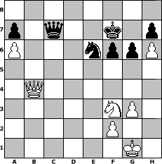 game notation in PGN-format [Event "2. Chess960/1"] [Site "www.myChess.de"] [Date "2008.03.15"] [Round "1"] [White "Offi@ (adv.)"] [Black "Alfigator"] [Variant "Fischerrandom"] [SetUp "1"] [FEN "rqnbbknr/pppppppp/8/8/8/8/PPPPPPPP/RQNBBKNR w KQkq - 0 1"] [WhitemyELO "1500"] [BlackmyELO "1501"] [Result "1/2-1/2"] [TimeControl "10/3456000"] [WhiteDays "128"] [BlackDays "147"] [MyChessNo "43413"] 1. c4 c5 2. Nf3 Nf6 3. O-O O-O 4. d3 d6 5. b4 cxb4 6. Bxb4 b5 7. cxb5 Qxb5 8. a4 Qa6 9. Bb3 Rb8 10. Bc3 e6 11. Qa2 d5 12. Qd2 Nd6 13. Bc2 Be7 14. Nb3 Nd7 15. Nbd4 e5 16. Nb5 f6 17. Bb3 Bf7 18. Bb4 Nc8 19. Rab1 Bxb4 20. Qxb4 Qb6 21. Qg4 Rd8 22. e4 Ne7 23. exd5 Bxd5 24. Bxd5+ Nxd5 25. d4 exd4 26. a5 Qa6 27. Nbxd4 Nf8 28. Rxb8 Rxb8 29. Re1 Qd3 30. Ne6 g6 31. Nxf8 Rxf8 32. h4 Nc7 33. Rc1 Rf7 34. h5 Qd7 35. Qh4 Ne6 36. h6 Rf8 37. Rb1 Kf7 38. a6 Rc8 39. Rb7 Rc7 40. Qb4 Qc6 41. Rxc7+ Qxc7 42. g3 1/2-1/2 position notation in FEN-format 8/p1q2k1p/P3nppP/8/1Q6/5NP1/5P2/6K1 - - - 0 42 Captured white pieces: Captured black pieces: Click on a captured piece in order to display the desired move!