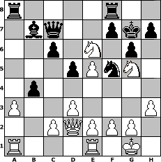 game notation in PGN-format [Event "Sommerturnier 2"] [Site "www.myChess.de"] [Date "2011.07.17"] [Round "1"] [White "Winston"] [Black "beowulf"] [ECO "B23"] [WhitemyELO "1440"] [BlackmyELO "1455"] [Result "1-0"] [TimeControl "10/1728000"] [WhiteDays "20"] [BlackDays "20"] [MyChessNo "75143"] 1. e4 c5 2. Nc3 Nc6 3. Nf3 d6 4. h3 g6 5. a3 Bg7 6. Bc4 e6 7. d3 Nge7 8. Bg5 O-O 9. Qd2 Qd7 10. Bh6 d5 11. Bb5 a6 12. Bxc6 bxc6 13. Bxg7 Kxg7 14. e5 Nf5 15. Na4 Qc7 16. Nxc5 Rb8 17. b4 Bb7 18. O-O Ra8 19. Rfe1 a5 20. Ng5 axb4 21. Ncxe6+ 1-0 position notation in FEN-format r4r2/1bq2pkp/2p1N1p1/3pPnN1/1p6/P2P3P/2PQPPP1/R3R1K1 - - - 0 21 Captured white pieces: Captured black pieces: Click on a captured piece in order to display the desired move!