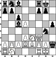 game notation in PGN-format [Event "Freibier f"] [Site "www.myChess.de"] [Date "2006.11.11"] [Round "1"] [White "bluescreenlover"] [Black "crca108"] [ECO "C42"] [WhitemyELO "1470"] [BlackmyELO "1374"] [Result "0-1"] [TimeControl "10/864000"] [WhiteDays "17"] [BlackDays "20"] [MyChessNo "30017"] 1. e4 e5 2. Nf3 Nf6 3. d3 Bc5 4. Nxe5 h5 5. Qf3 d6 6. Nc4 c6 7. Be2 Ng4 8. O-O O-O 9. Ne3 d5 10. exd5 Qc7 11. Bd2 Qxh2# 0-1 position notation in FEN-format rnb2rk1/pp3pp1/2p5/2bP3p/6n1/3PNQ2/PPPBBPPq/RN3RK1 - - - 0 12 Captured white pieces: Captured black pieces: Click on a captured piece in order to display the desired move!