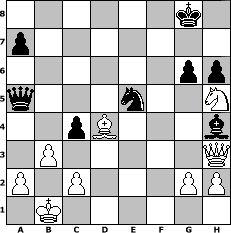 game notation in PGN-format [Event "1. Haithabu-Spiele"] [Site "www.myChess.de"] [Date "2008.08.15"] [Round "1"] [Board "1"] [White "muetoe"] [Black "Grubengeist"] [ECO "B33"] [WhitemyELO "1880"] [BlackmyELO "1956"] [Result "1/2-1/2"] [TimeControl "10/2592000"] [WhiteDays "28"] [BlackDays "26"] [MyChessNo "47176"] 1. e4 c5 2. Nf3 Nc6 3. d4 cxd4 4. Nxd4 Nf6 5. Nc3 d6 6. f4 g6 7. Nxc6 bxc6 8. e5 Nd7 9. exd6 exd6 10. Be3 Be7 11. Qd2 O-O 12. O-O-O Re8 13. Bd3 Qa5 14. Rhe1 Rb8 15. Kb1 d5 16. b3 Bb4 17. Bd4 Ba6 18. Bxa6 Qxa6 19. Rxe8+ Rxe8 20. Qf2 Ba3 21. Rd3 Qa5 22. Qh4 Bf8 23. f5 c5 24. fxg6 fxg6 25. Bf2 d4 26. Nd5 Re2 27. Nf4 Re4 28. Qg5 Ne5 29. Rd1 c4 30. Nh5 h6 31. Qg3 Be7 32. Rxd4 Bh4 33. Qh3 Rxd4 34. Bxd4 1/2-1/2 position notation in FEN-format 6k1/p7/6pp/q3n2N/2pB3b/1P5Q/P1P3PP/1K6 - - - 0 34 Captured white pieces: Captured black pieces: Click on a captured piece in order to display the desired move!