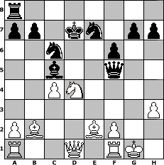 game notation in PGN-format [Event "mal spielen ohne drogen oder der k"] [Site "www.myChess.de"] [Date "2006.04.28"] [Round "1"] [White "nogumo"] [Black "Caligula"] [ECO "A00"] [WhitemyELO "1771"] [BlackmyELO "1519"] [Result "1-0"] [TimeControl "10/1728000"] [WhiteDays "40"] [BlackDays "40"] [MyChessNo "24941"] 1. b4 e5 2. Bb2 f6 3. e4 d5 4. exd5 Qxd5 5. c4 Qe4+ 6. Be2 Bxb4 7. Nf3 Nc6 8. O-O Bg4 9. Nc3 Qf5 10. Nd5 Bc5 11. Nxc7+ Kd7 12. Nxa8 Nge7 13. h3 Bxh3 14. gxh3 Rxa8 15. d4 exd4 16. Nxd4 1-0 position notation in FEN-format r7/pp1kn1pp/2n2p2/2b2q2/2PN4/7P/PB2BP2/R2Q1RK1 - - - 0 16 Captured white pieces: Captured black pieces: Click on a captured piece in order to display the desired move!