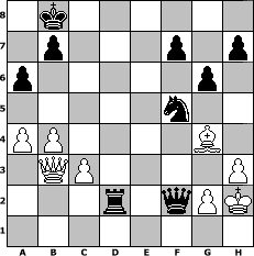game notation in PGN-format [Event "In Memorium Michael Knopf 4"] [Site "www.myChess.de"] [Date "2015.04.10"] [Round "1"] [White "Master1"] [Black "Schefsche"] [ECO "D00"] [WhitemyELO "1325"] [BlackmyELO "1475"] [Result "0-1"] [TimeControl "10/2592000"] [WhiteDays "074"] [BlackDays "105"] [MyChessNo "98931"] 1. d4 d5 2. e3 e5 3. dxe5 a6 4. Nc3 Bb4 5. Bd2 Bxc3 6. Bxc3 Nc6 7. Nf3 Bg4 8. Be2 Bxf3 9. Bxf3 Nce7 10. e4 c6 11. exd5 Nxd5 12. Bd4 Qe7 13. O-O O-O-O 14. Bg4+ Kb8 15. c3 Nh6 16. Bf3 Nf4 17. h3 c5 18. Bxc5 Qxc5 19. Qb3 Rd7 20. Rad1 Rhd8 21. Rxd7 Rxd7 22. Re1 Nd3 23. Re2 Nc1 24. Qc2 Nxe2+ 25. Bxe2 Qxe5 26. a4 Nf5 27. Bg4 g6 28. b4 Qe1+ 29. Kh2 Rd2 30. Qb3 Qxf2 0-1 position notation in FEN-format 1k6/1p3p1p/p5p1/5n2/PP4B1/1QP4P/3r1qPK/8 - - - 0 31 Captured white pieces: ![]() ![]() ![]() ![]() ![]() ![]() ![]() ![]() ![]() ![]() ![]() ![]() ![]() ![]() ![]() Captured black pieces: ![]() ![]() ![]() ![]() ![]() ![]() ![]() ![]() ![]() ![]() ![]() ![]() ![]() ![]() ![]() Click on a captured piece in order to display the desired move!