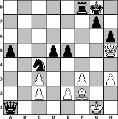 game notation in PGN-format [Event "Turnier gegen Regen :>"] [Site "www.myChess.de"] [Date "2006.09.04"] [Round "1"] [White "Juliette2103"] [Black "Caligula"] [ECO "C16"] [WhitemyELO "1692"] [BlackmyELO "1829"] [Result "0-1"] [TimeControl "10/1728000"] [WhiteDays "21"] [BlackDays "76"] [MyChessNo "28150"] 1. e4 e6 2. d4 d5 3. Nc3 Bb4 4. e5 Ne7 5. a3 Ba5 6. f4 Nf5 7. Nf3 c5 8. Bd3 Nxd4 9. Nxd4 cxd4 10. Bb5+ Bd7 11. Bxd7+ Qxd7 12. Qxd4 Nc6 13. Qa4 Bxc3+ 14. bxc3 O-O 15. O-O Rfc8 16. Bd2 Nxe5 17. Qd4 Nc4 18. Be1 b5 19. Rf3 f6 20. Rh3 h6 21. Rg3 e5 22. fxe5 fxe5 23. Qh4 Rc6 24. a4 bxa4 25. Rxa4 Rf8 26. Bf2 a5 27. Qh5 Rcf6 28. Rf3 Qxa4 29. h3 Rxf3 30. gxf3 Qa1+ 0-1 position notation in FEN-format 5rk1/6p1/7p/p2pp2Q/2n5/2P2P1P/2P1PB2/q5K1 - - - 1 31 Captured white pieces: Captured black pieces: Click on a captured piece in order to display the desired move!