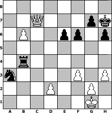 game notation in PGN-format [Event "April 2018"] [Site "www.myChess.de"] [Date "2018.04.11"] [Round "1"] [White "Steffi"] [Black "reisinger"] [ECO "D31"] [WhitemyELO "1557"] [BlackmyELO "1459"] [Result "1-0"] [TimeControl "10/1728000"] [WhiteDays "63"] [BlackDays "80"] [MyChessNo "111972"] 1. d4 d5 2. c4 e6 3. Nc3 Be7 4. Nf3 h6 5. e3 a6 6. Bd3 dxc4 7. Bxc4 b5 8. Be2 c5 9. O-O Nf6 10. a3 Bb7 11. Qc2 Nc6 12. dxc5 Bxc5 13. Nxb5 Bxe3 14. Bxe3 axb5 15. Bxb5 Rc8 16. Ne5 Qd5 17. Bxc6+ Bxc6 18. Nxc6 Rxc6 19. Qa4 O-O 20. Rfd1 Qc4 21. b4 Rfc8 22. Bc5 Ne4 23. Rac1 Rxc5 24. Rxc4 Rxc4 25. Qd7 Rc2 26. f3 Nf6 27. Qd3 R2c3 28. Qa6 Nd5 29. h3 Ne3 30. Re1 Nc2 31. Rc1 Nxa3 32. Rxc3 Rxc3 33. Qa8+ Kh7 34. Qb7 f6 35. b5 Rb3 36. b6 Rb4 37. Qc7 1-0 position notation in FEN-format 8/2Q3pk/1P2pp1p/8/1r6/n4P1P/3P2P1/6K1 - - - 2 37 Captured white pieces: Captured black pieces: Click on a captured piece in order to display the desired move!
