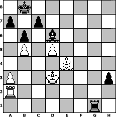 game notation in PGN-format [Event "HIGHLAND QUEEN I 2012"] [Site "www.myChess.de"] [Date "2012.03.01"] [Round "1"] [White "martinus"] [Black "Lemmi11"] [ECO "D02"] [WhitemyELO "1743"] [BlackmyELO "1830"] [Result "0-1"] [TimeControl "10/2592000"] [WhiteDays "30"] [BlackDays "28"] [MyChessNo "80251"] 1. d4 d5 2. Nf3 Nc6 3. g3 Bf5 4. a3 Nf6 5. Bg2 e6 6. O-O Qd7 7. Nc3 O-O-O 8. Ne5 Qe8 9. Bf4 Ne4 10. Nxc6 Qxc6 11. Nxe4 dxe4 12. c3 h5 13. h4 Be7 14. Qd2 f6 15. f3 e5 16. Be3 exf3 17. exf3 exd4 18. cxd4 Qb5 19. Rfc1 Bd6 20. f4 Rhe8 21. d5 Kb8 22. b4 Re7 23. Qd4 b6 24. Bf2 Bg4 25. Qc4 Qxc4 26. Rxc4 Rde8 27. Ra2 g5 28. hxg5 fxg5 29. fxg5 Rg7 30. Bd4 Rxg5 31. Bf6 Rgg8 32. Bh4 Re1+ 33. Kh2 Re3 34. Re4 Rb3 35. Bf1 Bf5 36. Re1 Rg4 37. Kg1 Be4 38. Bc4 Bxg3 39. Rxe4 Rb1+ 40. Kg2 Rxe4 41. Bd3 Rxh4 42. Bxb1 Bd6 43. b5 Rg4+ 44. Kf3 Rg3+ 45. Kf2 h4 46. Be4 Bc5+ 47. Kf1 Rg1+ 48. Ke2 h3 49. Kd3 Bd6 0-1 position notation in FEN-format 1k6/p1p5/1p1b4/1P1P4/4B3/P2K3p/R7/6r1 - - - 2 50 Captured white pieces: Captured black pieces: Click on a captured piece in order to display the desired move!