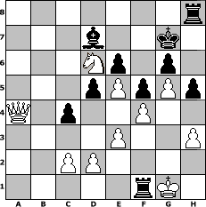 game notation in PGN-format [Event "Freischütz"] [Site "www.myChess.de"] [Date "2021.03.14"] [Round "2"] [White "Mynona"] [Black "lotchi"] [ECO "A40"] [WhitemyELO "1318"] [BlackmyELO "1349"] [Result "0-1"] [TimeControl "10/864000"] [WhiteDays "40"] [BlackDays "30"] [MyChessNo "121487"] 1. d4 g6 2. Bf4 Bg7 3. Nf3 d5 4. h3 Nc6 5. e3 f5 6. Nc3 e6 7. Nb5 Kf8 8. Bxc7 Qd7 9. Bd6+ Kf7 10. Ne5+ Bxe5 11. Bxe5 Nxe5 12. dxe5 a6 13. Nd6+ Kg7 14. f4 Ne7 15. g4 b5 16. g5 h5 17. Bd3 Nc6 18. a3 Na5 19. b4 Nc4 20. Bxc4 bxc4 21. Qd4 Qa4 22. Qc3 Bd7 23. O-O Rab8 24. Rf2 a5 25. Rb1 Rb6 26. Qa1 axb4 27. axb4 Rxb4 28. Qxa4 Rxb1+ 29. Rf1 Rxf1+ 0-1 position notation in FEN-format 7r/3b2k1/3Np1p1/3pPpPp/Q1p2P2/4P2P/2PP4/5rK1 - - - 0 30 Captured white pieces: Captured black pieces: Click on a captured piece in order to display the desired move!