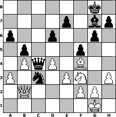 game notation in PGN-format [Event "Ein Turnier, ein Turnier! Oma wir danken dir!"] [Site "www.myChess.de"] [Date "2010.08.04"] [Round "1"] [White "Tomino"] [Black "Arijan"] [ECO "A45"] [WhitemyELO "1773"] [BlackmyELO "1471"] [Result "1-0"] [TimeControl "10/864000"] [WhiteDays "10"] [BlackDays "00"] [MyChessNo "67463"] 1. d4 Nf6 2. Bf4 g6 3. h3 Bg7 4. Nf3 O-O 5. e3 c5 6. Be2 b6 7. c3 Bb7 8. Nbd2 d6 9. O-O Nbd7 10. Rc1 a6 11. a3 b5 12. b4 cxd4 13. cxd4 Nb6 14. Qb3 Qd7 15. Rc2 Rfc8 16. Rfc1 Rxc2 17. Rxc2 Rc8 18. Ne1 Nfd5 19. Bh2 Na4 20. Bg4 f5 21. Bf3 Rxc2 22. Qxc2 Ndc3 23. Bxb7 Qxb7 24. Nb1 Nxb1 25. Qxb1 Qd5 26. Nf3 Nc3 27. Qb2 Qc4 28. Bf4 1-0 position notation in FEN-format 6k1/4p1bp/p2p2p1/1p3p2/1PqP1B2/P1n1PN1P/1Q3PP1/6K1 - - - 6 28 Captured white pieces: ![]() ![]() ![]() ![]() ![]() ![]() ![]() ![]() ![]() ![]() ![]() ![]() ![]() ![]() ![]() Captured black pieces: ![]() ![]() ![]() ![]() ![]() ![]() ![]() ![]() ![]() ![]() ![]() ![]() ![]() ![]() ![]() Click on a captured piece in order to display the desired move!