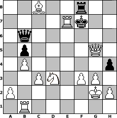 | game notation in PGN-format [Event "Wanderpokal November 2006 -"] [Site "www.myChess.de"] [Date "2006.12.01"] [Round "1"] [White "reymund"] [Black "tuergeist"] [Variant "Fischerrandom"] [SetUp "1"] [FEN "brnbkrnq/pppppppp/8/8/8/8/PPPPPPPP/BRNBKRNQ w KQkq - 0 1"] [WhitemyELO "1500"] [BlackmyELO "1273"] [Result "1-0"] [TimeControl "10/864000"] [WhiteDays "10"] [BlackDays "02"] [MyChessNo "30659"] 1. Nf3 f6 2. g3 Nd6 3. b4 h5 4. d3 b5 5. e4 e5 6. Qg2 Qh7 7. O-O f5 8. Nxe5 fxe4 9. dxe4 g5 10. f3 Bf6 11. Qf2 h4 12. Qxa7 Ke7 13. Qxc7 Bxe5 14. Bxe5 Qg6 15. Qc5 Rbc8 16. Bxd6+ Qxd6 17. Qxg5+ Nf6 18. e5 Qb6+ 19. Kg2 Rc6 20. Re1 Kf7 21. exf6 Rxf6 22. Nd3 d6 23. c3 Bd5 24. Qxd5+ Kg7 25. Qg5+ Kf7 26. Bb3+ d5 27. Bxd5+ Re6 28. Bxe6+ Ke8 29. Bc8+ Kf7 30. Re7# 1-0 position notation in FEN-format 2B2r2/4Rk2/1q6/1p4Q1/1P5p/2PN1PP1/P5KP/1R6 - - - 4 30 Captured white pieces:                              Captured black pieces:                               Click on a captured piece in order to display the desired move!