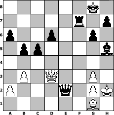 game notation in PGN-format [Event "Myschach 960er Blitz-Open"] [Site "www.myChess.de"] [Date "2006.02.28"] [Round "1"] [White "Master1"] [Black "Seneca"] [Variant "Fischerrandom"] [SetUp "1"] [FEN "qnnrkrbb/pppppppp/8/8/8/8/PPPPPPPP/QNNRKRBB w KQkq - 0 1"] [WhitemyELO "1099"] [BlackmyELO "1722"] [Result "0-1"] [TimeControl "10/86400"] [WhiteDays "03"] [BlackDays "04"] [MyChessNo "23066"] 1. g3 Nc6 2. Nc3 g6 3. Nb5 Qb8 4. f4 a6 5. Nc3 Bxc3 6. dxc3 f6 7. e3 Nb6 8. Nb3 d6 9. e4 Bf7 10. Nd4 O-O 11. b3 Nxd4 12. cxd4 Nd7 13. c4 e5 14. d5 exf4 15. Rxf4 Ne5 16. Rxf6 b5 17. c5 Ng4 18. c6 Nxf6 19. Qxf6 Bxd5 20. Qh4 Bxc6 21. Bd4 Rde8 22. Qh6 Rf7 23. Rd2 Bxe4 24. Rf2 Bxh1+ 25. Kf1 Rxf2+ 26. Kxf2 Rf8+ 27. Kg1 Rf7 28. h4 Bf3 29. Kh2 Qc8 30. h5 Bxh5 31. Qd2 c5 32. Bg1 Qe6 33. Qd3 Qe2+ 0-1 position notation in FEN-format 6k1/5r1p/p2p2p1/1pp4b/8/1P1Q2P1/P3q1PK/6B1 - - - 4 34 Captured white pieces: Captured black pieces: Click on a captured piece in order to display the desired move!