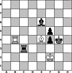 game notation in PGN-format [Event "Der Weihnachtsmann kommt bald."] [Site "www.myChess.de"] [Date "2010.11.05"] [Round "1"] [White "martinus"] [Black "Helmut48"] [ECO "C21"] [WhitemyELO "1761"] [BlackmyELO "1833"] [Result "0-1"] [TimeControl "10/1728000"] [WhiteDays "82"] [BlackDays "98"] [MyChessNo "69540"] 1. e4 e5 2. d4 exd4 3. c3 d5 4. Qxd4 dxe4 5. Qxd8+ Kxd8 6. f3 Nf6 7. Bg5 exf3 8. Nxf3 Bd6 9. Nbd2 Re8+ 10. Be2 Bd7 11. Kf2 Bc5+ 12. Nd4 Nc6 13. N2b3 Nxd4 14. Bxf6+ gxf6 15. cxd4 Bd6 16. Bf3 c6 17. Rac1 Be6 18. Nc5 Bxc5 19. Rxc5 Ke7 20. Re1 Rad8 21. Re4 Rg8 22. Rh5 Rg5 23. Rxh7 f5 24. Re2 Rxd4 25. b3 Rg8 26. Rh6 a5 27. h3 Rgd8 28. g4 Rd2 29. g5 a4 30. bxa4 Rxe2+ 31. Kxe2 Rd4 32. Rh8 Rxa4 33. Rb8 Rxa2+ 34. Ke3 Rh2 35. Rxb7+ Kd6 36. Rb6 Ke5 37. Bxc6 Rxh3+ 38. Kf2 Rh5 39. Kf3 Rxg5 40. Rb5+ Kf6 41. Kf4 Rg4+ 42. Kf3 Kg5 43. Ke3 Rc4 44. Bd5 Rc3+ 45. Kf2 Kg4 46. Rb4+ f4 47. Be4 f5 0-1 position notation in FEN-format 8/8/4b3/5p2/1R2Bpk1/2r5/5K2/8 - - - 0 48 Captured white pieces: Captured black pieces: Click on a captured piece in order to display the desired move!