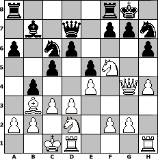 game notation in PGN-format [Event "Novemberturnier"] [Site "www.myChess.de"] [Date "2004.11.04"] [Round "1"] [White "rikilatic"] [Black "Wormatia08"] [ECO "B20"] [WhitemyELO "1384"] [BlackmyELO "1541"] [Result "1-0"] [TimeControl "10/2592000"] [WhiteDays "60"] [BlackDays "55"] [MyChessNo "7777"] 1. e4 c5 2. Bc4 d6 3. Qf3 Nf6 4. d3 Nc6 5. c3 e6 6. Bf4 Be7 7. h3 O-O 8. Nd2 a6 9. Ne2 b5 10. Bb3 Bb7 11. h4 e5 12. Bg5 h6 13. O-O-O Nh7 14. Bxe7 Qxe7 15. Ng3 b4 16. Nf5 Qd7 17. Qg4 1-0 position notation in FEN-format r4rk1/1b1q1ppn/p1np3p/2p1pN2/1p2P1QP/1BPP4/PP1N1PP1/2KR3R - - - 3 17 Captured white pieces: Captured black pieces: Click on a captured piece in order to display the desired move!