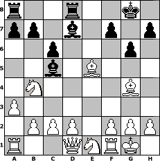game notation in PGN-format [Event "uns Nr. 6"] [Site "www.myChess.de"] [Date "2012.10.27"] [Round "1"] [White "OwainGwynedd"] [Black "MiFie"] [ECO "A40"] [WhitemyELO "1378"] [BlackmyELO "1093"] [Result "1-0"] [TimeControl "10/864000"] [WhiteDays "10"] [BlackDays "02"] [MyChessNo "84729"] 1. d4 Nc6 2. e4 Nf6 3. Nc3 e6 4. a3 d5 5. e5 g6 6. exf6 Qxf6 7. Be2 Nxd4 8. Be3 Bd7 9. Bxd4 e5 10. Nxd5 Qd6 11. Bc3 c6 12. Nb4 Qe6 13. Nf3 Qg4 14. O-O Bc5 15. Bxe5 O-O 16. Ne1 Rfd8 17. Bxg4 1-0 position notation in FEN-format r2r2k1/pp1b1p1p/2p3p1/2b1B3/1N4B1/P7/1PPP1PPP/R2QNRK1 - - - 0 17 Captured white pieces: Captured black pieces: Click on a captured piece in order to display the desired move!