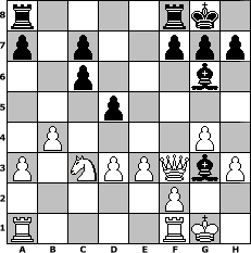 game notation in PGN-format [Event "Freizeitschach"] [Site "www.myChess.de"] [Date "2011.02.28"] [Round "1"] [White "Knight"] [Black "Steppenwolf"] [ECO "A00"] [WhitemyELO "1153"] [BlackmyELO "1146"] [Result "1-0"] [TimeControl "10/2592000"] [WhiteDays "60"] [BlackDays "40"] [MyChessNo "72378"] 1. b4 e5 2. Bb2 e4 3. e3 d5 4. a3 Nf6 5. Bb5+ Nc6 6. Ne2 Bg4 7. O-O Bd6 8. Bxc6+ bxc6 9. h3 Bh5 10. g4 Bg6 11. Bxf6 Qxf6 12. Nbc3 Qf3 13. Ng3 O-O 14. d4 exd3 15. cxd3 Bxg3 16. Qxf3 1-0 position notation in FEN-format r4rk1/p1p2ppp/2p3b1/3p4/1P4P1/P1NPPQbP/5P2/R4RK1 - - - 0 16 Captured white pieces: Captured black pieces: Click on a captured piece in order to display the desired move!