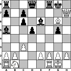 game notation in PGN-format [Event "3. Frankenwaldturnier"] [Site "www.myChess.de"] [Date "2007.05.07"] [Round "2"] [White "Andreas"] [Black "Hannes"] [ECO "C45"] [WhitemyELO "1670"] [BlackmyELO "1500"] [Result "1-0"] [TimeControl "10/1728000"] [WhiteDays "19"] [BlackDays "20"] [MyChessNo "34638"] 1. e4 e5 2. Nf3 Nc6 3. d4 exd4 4. Nxd4 d5 5. Nxc6 bxc6 6. e5 Be6 7. Bd3 Bb4+ 8. c3 Ba5 9. O-O Ne7 10. Be3 O-O 11. Qh5 Ng6 12. Bg5 f6 13. exf6 gxf6 14. Bxg6 fxg5 15. Qxh7# 1-0 position notation in FEN-format r2q1rk1/p1p4Q/2p1b1B1/b2p2p1/8/2P5/PP2PPPP/RN3RK1 - - - 0 15 Captured white pieces: ![]() ![]() ![]() ![]() ![]() ![]() ![]() ![]() ![]() ![]() ![]() ![]() ![]() ![]() ![]() Captured black pieces: ![]() ![]() ![]() ![]() ![]() ![]() ![]() ![]() ![]() ![]() ![]() ![]() ![]() ![]() ![]() Click on a captured piece in order to display the desired move!