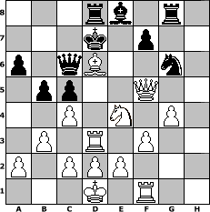 game notation in PGN-format [Event "960er Sommer Turnier"] [Site "www.myChess.de"] [Date "2006.05.20"] [Round "1"] [White "bane"] [Black "chrisrockdsc"] [Variant "Fischerrandom"] [SetUp "1"] [FEN "qbrkbrnn/pppppppp/8/8/8/8/PPPPPPPP/QBRKBRNN w KQkq - 0 1"] [WhitemyELO "1945"] [BlackmyELO "1430"] [Result "1-0"] [TimeControl "10/864000"] [WhiteDays "10"] [BlackDays "09"] [MyChessNo "25572"] 1. c4 c5 2. Nf3 Nf6 3. b3 b6 4. g3 Nh5 5. g4 Nf4 6. Qxg7 Nhg6 7. Bxg6 Nxg6 8. Qxh7 Rh8 9. Qg7 Bf4 10. Qc3 e5 11. h4 Nxh4 12. Nxe5 Bxe5 13. Qxe5 Ng6 14. Qf6+ Kc7 15. f3 d6 16. Ng3 a6 17. Ne4 Rd8 18. Bg3 Qc6 19. Rc3 b5 20. Rd3 Rg8 21. Bxd6+ Kd7 22. Qf5# 1-0 position notation in FEN-format 3rb1r1/3k1p2/p1qB2n1/1pp2Q2/2P1N1P1/1P1R1P2/P1PPP3/3K1R2 - K - 2 22 Captured white pieces: Captured black pieces: Click on a captured piece in order to display the desired move!
