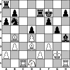 game notation in PGN-format [Event "Arpad Elo Geburtstagstunier"] [Site "www.myChess.de"] [Date "2011.08.23"] [Round "1"] [White "bjeu"] [Black "nogumo"] [ECO "C43"] [WhitemyELO "2099"] [BlackmyELO "1684"] [Result "1-0"] [TimeControl "10/1728000"] [WhiteDays "08"] [BlackDays "19"] [MyChessNo "75714"] 1. e4 e5 2. Nf3 Nf6 3. d4 Nxe4 4. Nxe5 d5 5. Bd3 Qf6 6. O-O Bd6 7. c4 c6 8. cxd5 cxd5 9. Bb5+ Bd7 10. Nxd7 Nxd7 11. f3 Qh4 12. g3 Nxg3 13. Qe1+ Kd8 14. hxg3 Bxg3 15. Qd2 Re8 16. Qg5+ Qxg5 17. Bxg5+ f6 18. Bd2 Re7 19. Nc3 a6 20. Bd3 Nb6 21. Kg2 Bh4 22. Rac1 g6 23. Rh1 g5 24. b3 Ke8 25. Nd1 Kf7 26. Bb4 1-0 position notation in FEN-format r7/1p2rk1p/pn3p2/3p2p1/1B1P3b/1P1B1P2/P3P1K1/2RN3R - - - 4 26 Captured white pieces: Captured black pieces: Click on a captured piece in order to display the desired move!