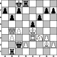game notation in PGN-format [Event "Albspiele 13"] [Site "www.myChess.de"] [Date "2011.06.10"] [Round "1"] [White "Knight"] [Black "haggard"] [ECO "D00"] [WhitemyELO "1075"] [BlackmyELO "1937"] [Result "0-1"] [TimeControl "10/1728000"] [WhiteDays "19"] [BlackDays "20"] [MyChessNo "74516"] 1. d4 d5 2. e4 dxe4 3. Nc3 Nf6 4. f3 exf3 5. Qxf3 Qxd4 6. Be3 Qh4+ 7. g3 Qg4 8. Qf2 Ne4 9. Nxe4 Qxe4 10. Nf3 f6 11. O-O-O e5 12. Bg2 Qa4 13. Kb1 Be6 14. b3 Qa6 15. c4 Nd7 16. Rc1 Ba3 17. Rc2 Bf5 18. Re1 O-O-O 19. Ka1 Nc5 20. Bxc5 Bxc5 21. Qxc5 Bxc2 22. Re3 b6 23. Qb4 Rd1+ 24. Kb2 Rb1+ 25. Kxc2 Qxa2+ 26. Kd3 Rd8+ 27. Ke4 Qc2+ 0-1 position notation in FEN-format 2kr4/p1p3pp/1p3p2/4p3/1QP1K3/1P2RNP1/2qP2BP/1r6 - - - 4 28 Captured white pieces: Captured black pieces: Click on a captured piece in order to display the desired move!