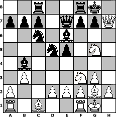 game notation in PGN-format [Event "1.Chess in Friendship"] [Site "www.myChess.de"] [Date "2004.08.10"] [Round "1"] [White "Schili"] [Black "Wormatia08"] [ECO "A22"] [WhitemyELO "1500"] [BlackmyELO "1583"] [Result "1-0"] [TimeControl "10/2592000"] [WhiteDays "55"] [BlackDays "57"] [MyChessNo "6086"] 1. c4 e5 2. Nc3 Nf6 3. Nf3 Nc6 4. g3 Bb4 5. Qc2 d6 6. Bg2 O-O 7. O-O Be6 8. b3 d5 9. cxd5 Nxd5 10. Ne4 Rc8 11. Neg5 Qe7 12. Qxh7# 1-0 position notation in FEN-format 2r2rk1/ppp1qppQ/2n1b3/3np1N1/1b6/1P3NP1/P2PPPBP/R1B2RK1 - - - 0 12 Captured white pieces: Captured black pieces: Click on a captured piece in order to display the desired move!
