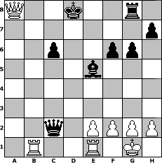 game notation in PGN-format [Event "War Chess"] [Site "www.myChess.de"] [Date "2006.08.20"] [Round "1"] [White "rikilatic"] [Black "Andylein1989"] [ECO "C24"] [WhitemyELO "1567"] [BlackmyELO "1549"] [Result "1-0"] [TimeControl "10/2592000"] [WhiteDays "73"] [BlackDays "80"] [MyChessNo "27840"] 1. e4 e5 2. Bc4 Nf6 3. d3 d5 4. exd5 Nxd5 5. Qf3 c6 6. Nc3 Be6 7. Bxd5 Bxd5 8. Nxd5 Qxd5 9. Qg4 Nd7 10. Nf3 g6 11. O-O Nf6 12. Qg5 Nd7 13. Re1 Bd6 14. d4 f6 15. Qh6 O-O-O 16. dxe5 Nxe5 17. Nxe5 Bxe5 18. Be3 Bxb2 19. Rab1 Be5 20. Bxa7 Qa5 21. Bb6 Qxa2 22. Bxd8 Kxd8 23. Qg7 Rg8 24. Qxb7 Qxc2 25. Qa8+ 1-0 position notation in FEN-format Q2k2r1/7p/2p2pp1/4b3/8/8/2q1PPPP/1R2R1K1 - - - 1 25 Captured white pieces: Captured black pieces: Click on a captured piece in order to display the desired move!